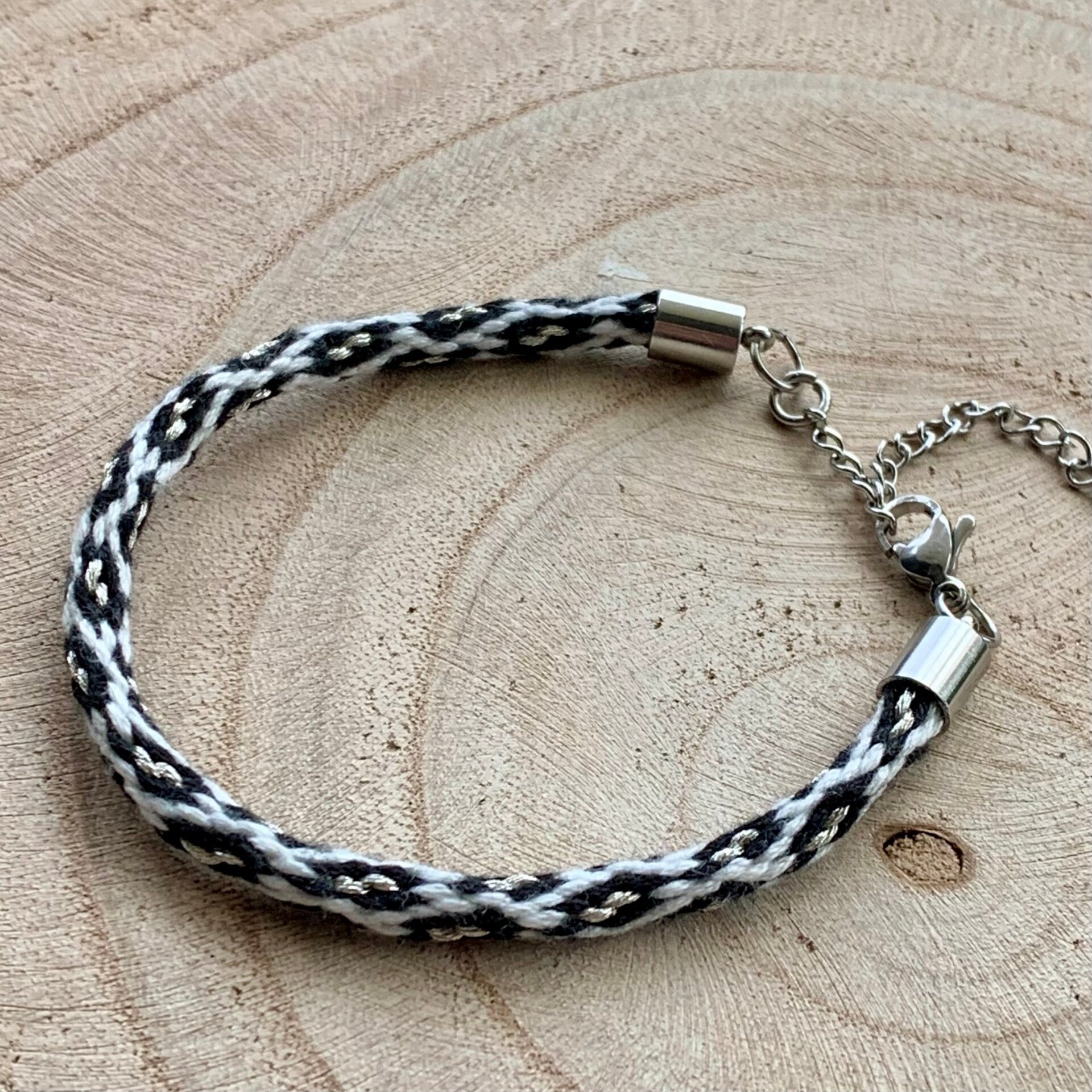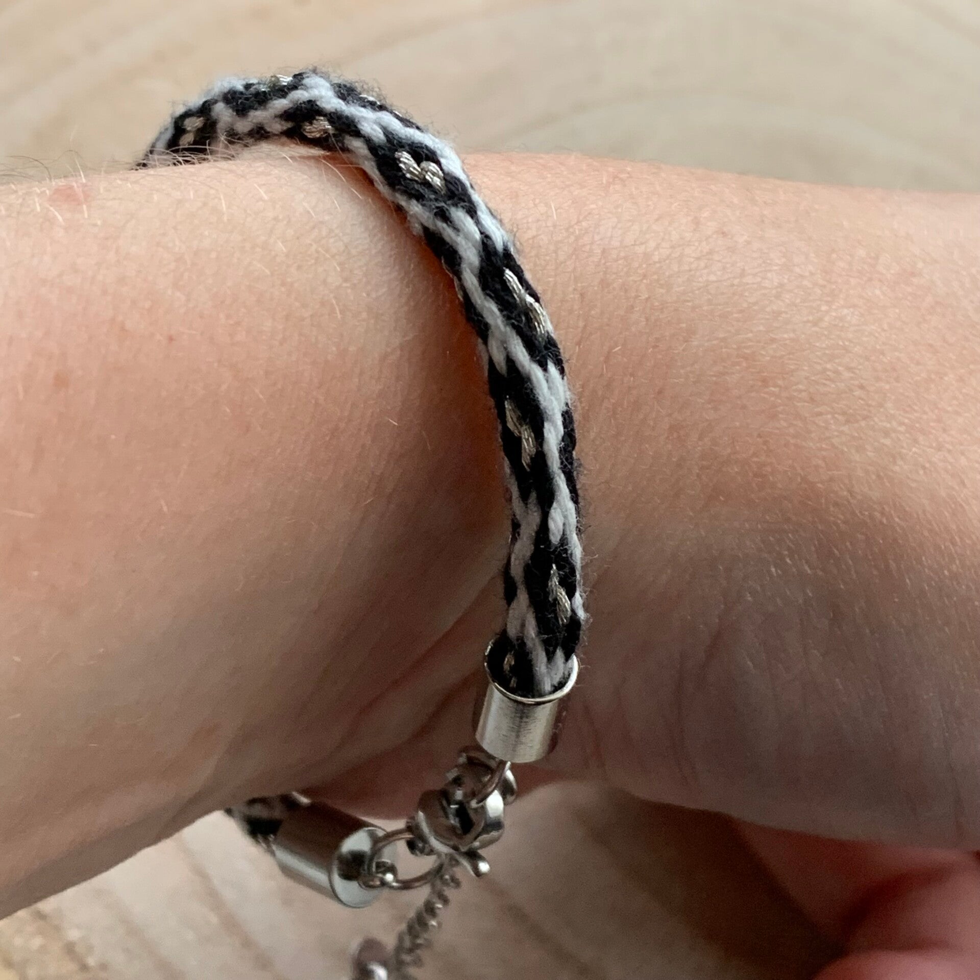 Hand gevlochen armband afgewerkt met stainlesssteel materiaal.